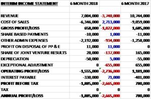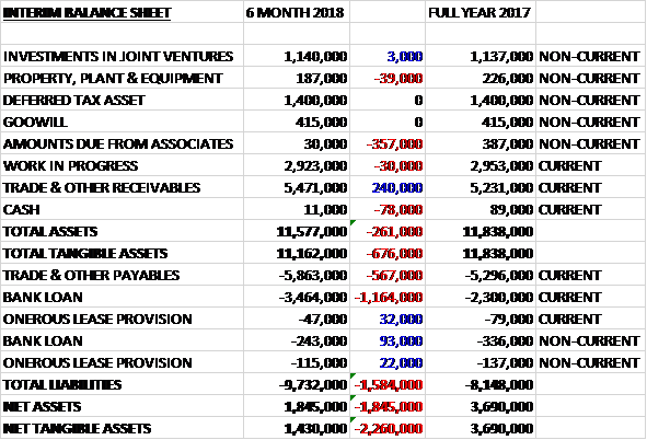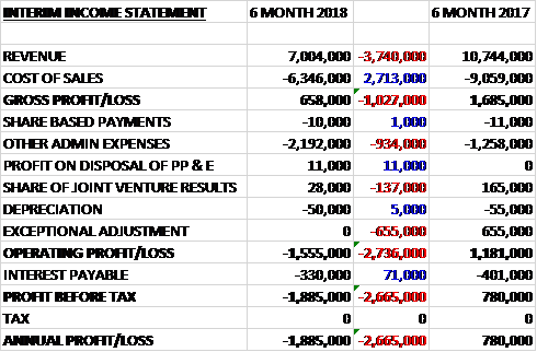 When compared to the first half of last year, revenues declined by £3.7M and with cost of sales only falling by £2.7M the gross profit fell by £1M. There was a £934K growth in admin expenses and joint venture profits fell by £137K. There was also no exceptional adjustment which brought in £655K last time. After interest payments declined by £71k the loss for the period was £1.9M, a deterioration of £2.7M year on year.