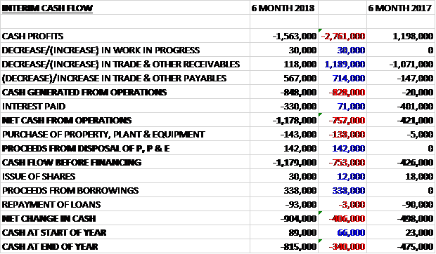 Before movements in working capital, cash profits declined by £2.8M to become a cash loss of £1.6M. There was a cash inflow from working capital and after interest payments reduced by £71K, the net cash outflow from operations was £1.2M, an increase of £757K year on year. The group spent a net £1K on capex to give a cash outflow of £1.2M before financing and after a net £245K was taken out in new loans the cash outflow was £904K and the cash level at the period-end was -£815K.