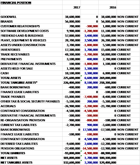 Revenues declined when compared to last year due to the extra week in 2016, with a £1.4M fall in carbonates revenue and a £1.1M decline in still drinks revenue, partially offset by a £1M growth in other revenue. Cost of sales also fell during the year to give a gross profit £400K below that of 2016. The group did get £700K in compensation from a terminated contract but suffered £1.8M of redundancy costs and fairly modest growth in distribution costs, amortisation, operating lease costs and share based payments, counteracted by a small fall in depreciation and a £1.8M decline in other admin expenses. We then see a £7M gain from the curtailment of the pension scheme offset by a £400K abortive acquisition cost, a £500K online sales capability investigation, £1.3M of other pension closure costs and £1.5M in other redundancy costs which meant that the operating profit grew by £1.7M. Finance costs fell somewhat, but tax charges increased by £500K to give a profit for the year of £35.6M, a growth of £1.3M year on year.