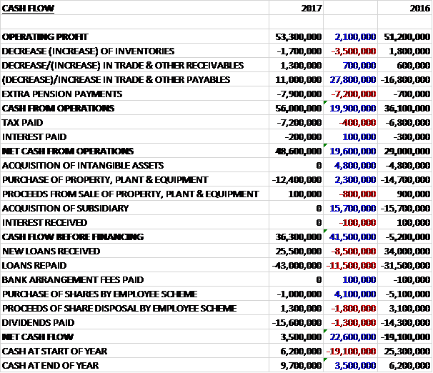 Before movements in working capital, cash profits increased by £2.1M to £53.3M. There was a cash inflow from working capital due to the increase in payables and even after £7.2M of extra pension payments the net cash from operations came in at £48.6M, a growth of £19.6M year on year. The group spent £12.4M on property, plant and equipment which meant that the free cash flow was £36.3M. Of this, £15.6M was spent on dividends and there was a net £17.5M repayment of loans to give a cash flow for the year of £3.5M and a cash level of £9.7M at the year-end.