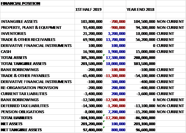 When compared to the end point of last year, total assets increased by £17.3M driven by a £13.7M growth in receivables, a £3.2M increase in inventories and a £1.9M growth in cash. Total liabilities also increased during the period as a £7.2M decline in pension obligations was more than offset by a £12.6M increase in bank borrowings and an £11.3M increase in payables. The end result was a net tangible asset level of £97.4M, a growth of £800K over the past six months.