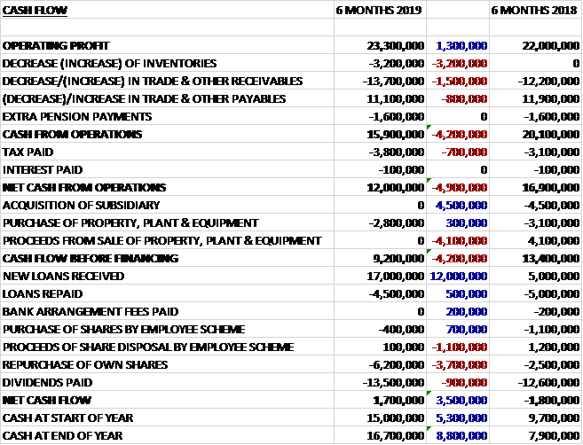 Before movements in working capital, cash profits increased by £1.3M to £23.3M. There was a cash outflow from working capital and tax payments increased by £700K to give a net cash from operations of £12M, a decline of £4.9M year on year. The group spent £2.8M on capex to give a free cash flow of £9.2M. This did not cover the £13.5M paid out in dividends or the £6.2M spent on share repurchases so the group took out a net £12.5M. This gave a cash flow of £1.7 for the period and a cash level of £16.7M at the period-end.