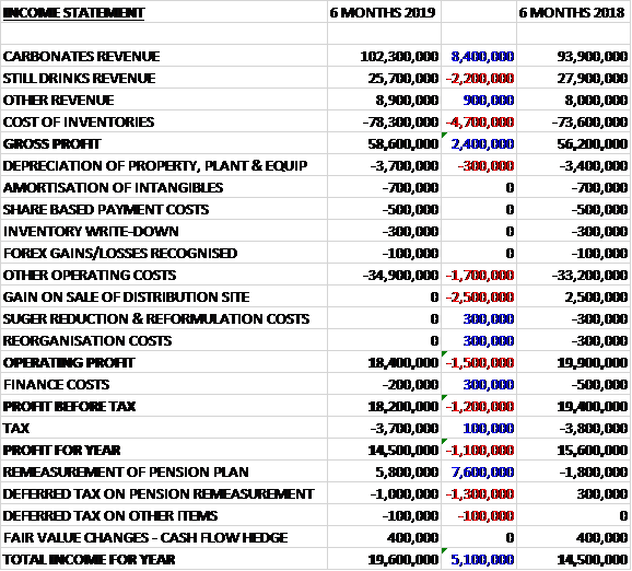 Revenues increased when compared to the first half of last year as a £2.2M decline in still drinks revenue was more than offset by an £8.4M increase in carbonates revenue and a £900K growth in other revenue. Cost of sales also increased to give a gross profit £2.4M higher. Operating costs increased by £2M and there was no sale of buildings, which brought in £2.5M last time. There was also no reformulation costs or reorganisation costs, which were both £300K last time which meant the operating profit declined by £1.5M. Finance costs were down £300K and tax charges fell by £100K to give a profit for the period of £14.5M, a decline of £1.1M year on year.
