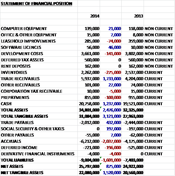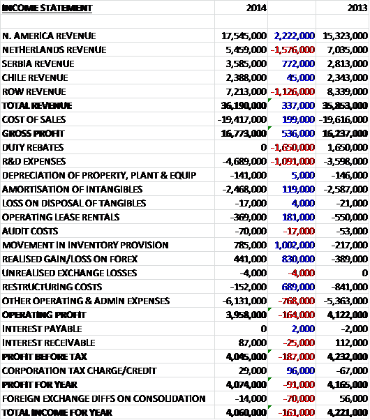 When compared to last year total revenues were £337K higher, driven by North America and Serbia, somewhat offset by reductions in Netherlands and ROW sales due to difficult conditions in Western Europe. Cost of sales were also somewhat lower so that gross profits were £536K higher at £16.8M. R&D expenses increased by £1M as less expenditure was capitalised but there was a reversal with regards to inventory provisions. Other operating costs were also some £768K higher and there was the lack of the duty rebates that occurred last year but restructuring costs were some £689K lower so that operating profit fell by £164K. There was then slightly less interest receivable, offset by a corporation tax rebate so that the overall profit for the year was £4.1M, a decline of £91K when compared to 2013, although those duty rebates last year were the underlying cause of this fall.