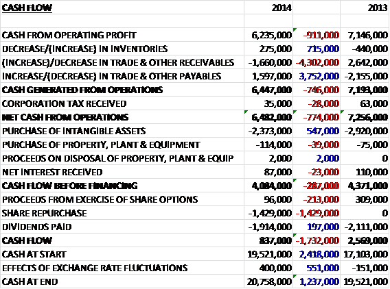 Before movements in working capital, the cash profits fell by £911K to £6.2M before payables and receivables broadly cancelled each other out so that net cash from operations was some £774K lower at £6.5M. The bulk of this cash was spent on intangible assets with a small amount on the purchase of property, plant and equipment so that free cash flow was down £287K to £4.1M. The group spent this fee cash on dividends and a share buy-back programme which still left a cash inflow of £837K, added to the big £19.5M cash pile at the beginning of the year. Despite the decline, the group is still pleasingly cash generative.