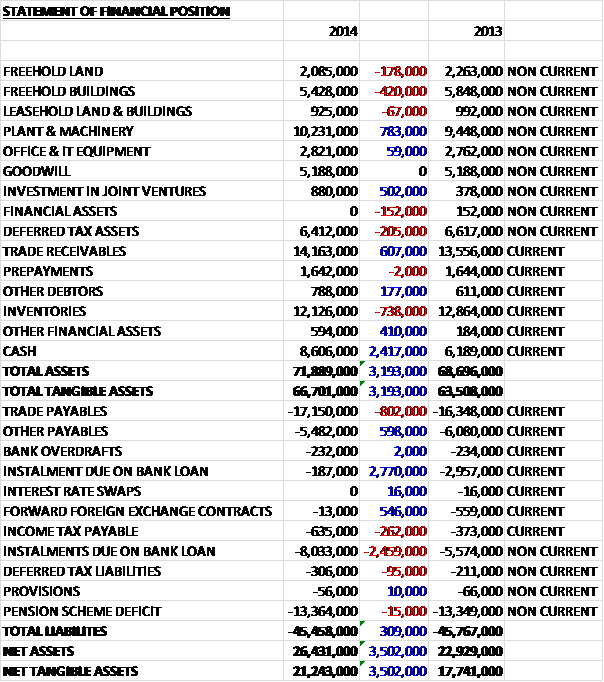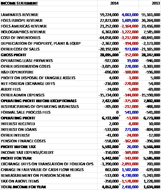 Revenues increased in the Laminates and European Foils business but fell in the Americas Foils and Holographics business.  Cost of inventories also increased to give a gross profit some £152K lower than in 2013.  A fall in distribution costs was counteracted by an increase in Admin expenses so that before exceptional items, operating profit was £375K lower than last year.  The lack of a sale process fee that occurred last year meant that actual operating profit was just £51K lower at £6.7M.  The group spent over £1M on loan interest and pension costs but the interest was £271K lower than in 2013, counteracted by a nominal tax charge (compared to a small rebate last year) due to historic losses.  There remains £2.1M of tax losses in the UK and $4.1M in the US.  This meant that the profit for the year, at £5.4M, was £143K lower than in 2013.