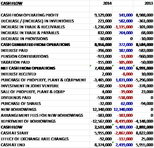 Before movements in working capital, cash profits were £141K higher at £9.1M.  An increase in receivables was broadly counteracted by other working capital movements so that cash generated from operations increased by £372K to just under £9M.  The group spent almost £1M of this cash on the pension scheme and just under £400K on interest to give a net cash from operations of £7.4M.  Nearly half of this, £3.5M was spent on the tangible asset purchases including two new foil metallisers and a new IT system, and half a million pounds was spent on joint ventures, relating to API Optixin the Czech rep.  There was also half a million spent on dividends to result in a cash inflow of £2.5M which is a pretty decent result.