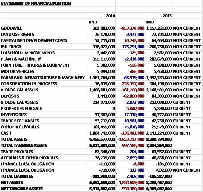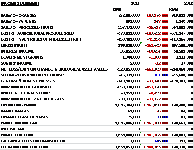 On the 7th November the group announced the results of negotiations over the winter orange contracts for the upcoming crop. So, is it good news? Well, it’s ACHL so of course it’s now. The good news first – the average selling price at the more important (for winter oranges) Xinfeng plantation increased by 2.6% when compared to last year but the quantity supplied at 113,600 tonnes, represents a fall of 7.8%. This is being blamed on “cryogenic freezing rain”. Wow, that sounds pretty nasty… Also, frosts have apparently affected the Orange blossom. At the much maligned Hepu plantation, the selling price has collapsed by 40% as canker ravaged oranges don’t look too good apparently. The price is almost inconsequential though because the group only managed to sell just over 7,000 tonnes after Typhoon Rammasun took its toll, representing a 71% decline. Clearly as a result of the above there will be a reduction in revenue and profit generated for the year ending 2015. I keep waiting for a point where these shares become investable and the inherent value tied up in the group is released but I continue to wait after this update.