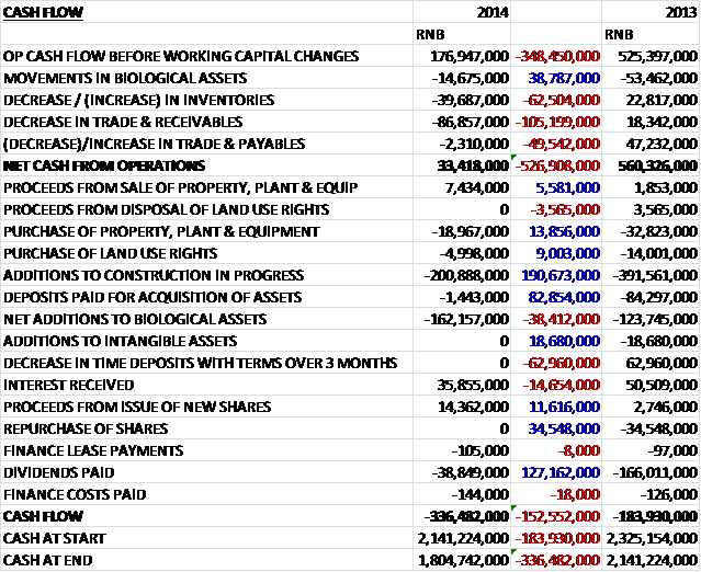 Before movements in working capital the cash generated from operations fell by £34.8M to £17.7M. An increase in inventories and decrease in receivables meant that net cash from operations deteriorated further by £52.7M to £3.3M. The group reigned back its cash spending in many areas but despite nearly halving still spent £20.1M on new constructions. The next largest spend was the £16.2M paid for biological assets which is clearly more cash than the group is getting from operations so cash flow this year was an outflow of £33.6M, some £15.2M less than in 2013 to leave a still fairly comfortable £180.5M in the bank at the year end.