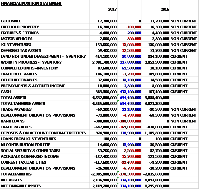 When compared to the end point of last year, total assets increased by £694.4M, driven by a £478.1M growth in cash, a £127.8M increase in work in progress, a £69.5M growth in completed units, a £30M increase in land not under development and an £18.1M growth in other receivables, partially offset by a £15M decline in joint ventures and a £12.5M decrease in deferred tax assets. Total liabilities also increased during the year as a £130.9M decline in deposits on account and a £21.1M fall in trade payables were more than offset by a £300M increase in bank loans, a £169M growth in trade payables, a £39.4M increase in current tax liabilities and a £15.9M increase in accruals and deferred income. The end result was a net tangible asset level of £2.119BN, a growth of £324.1M year on year.