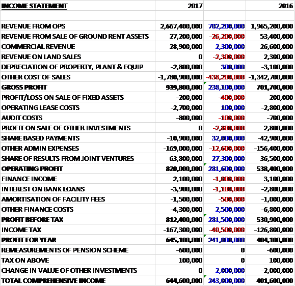 Revenues from the sale of ground rents reduced by £26.2M and revenue from land sales fell by £2.3M but revenue from operations increased by £702.2M and commercial revenue was up £2.3M. cost of sales grew by £437.9M which meant that the gross profit was £238.1M higher. Share based payments declined by £32M and there was a £27.3M increase in the contribution from joint ventures but there was no sale of investments, which made £2.8M last time, and other admin expenses were up £12.6M to give an operating profit £281.6M higher. Finance income was down £1M, there was a £1.1M increase in bank loan interest and a £500K growth in the amortisation of facility fees but other finance costs were down £2.5M and after tax charges increased by £40.5M there was a profit of £645.1M for the year, a growth of £241M year on year.