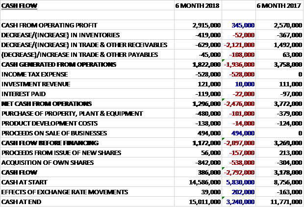 Before movements in working capital, cash profits increased by £345K to £2.9M. There was a cash outflow from working capital with a large increase in receivables and after tax payments increased by £528K the net cash from operations was £1.3M, a decline of £2.5M year on year. The group spent £480K on fixed assets and £138K on development costs but the recouped £494K from the sale of a business to give a free cash flow of £1.2M. Of this, £842K was used to buy their own shares for cancellation to give a cash flow of £386K and a cash level of £15M at the period-end.