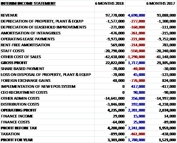 Revenues increased by £4.7M when compared to the first half of last year. Depreciation was up £437K, amortisation increased by £261K, operating lease payments grew by £221K, staff costs were up £550K and other cost of sales grew by £1.3M to give a gross profit £1.7M ahead of last time. There was a £776K reduction in forex gains but this was offset by the lack of any EPOS system costs, a £356K reduction in other admin costs and a £392K fall in distribution costs to give an operating profit £2.2M higher. Finance costs reduced slightly but tax charges grew by £461K which meant that the profit for the period was £3.3M, a growth of £1.8M year on year.
