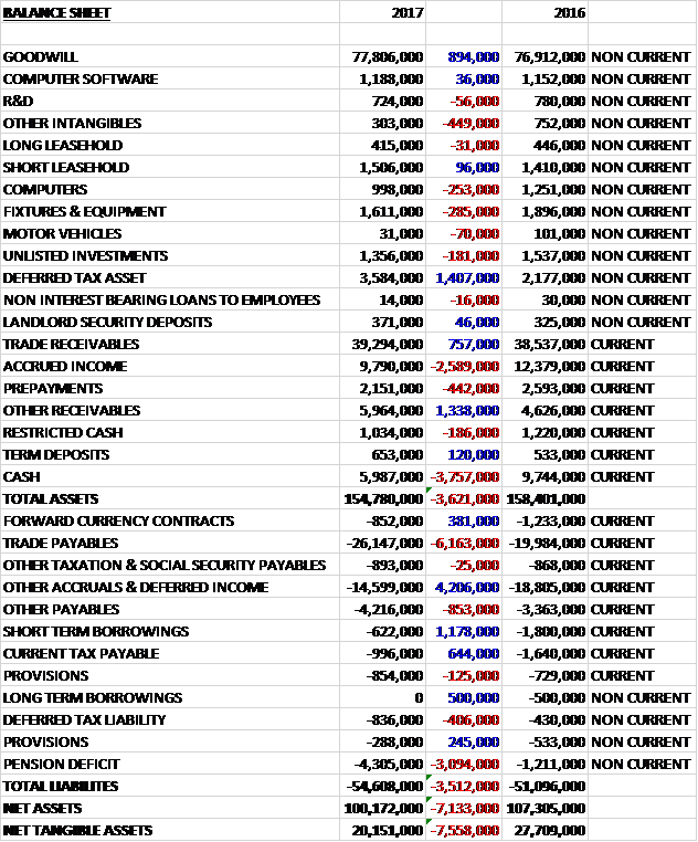 When compared to the end point of last year, total assets declined by £3.6M driven by a £2.9M decrease in accrued income, a £449K fall in other intangibles and a £442K decline in prepayments, partially offset by a £1.4M growth in deferred tax assets, a £1.3M increase in other receivables and an £894K growth in goodwill. Total liabilities increased during the year as a £4.2M decline in accruals and deferred income, a £1.2M fall in short term borrowings and a £644K decline in current tax payables were more than offset by a £6.2M growth in trade payables and an £853K increase in other payables. The end result was a net tangible asset level of £20.2M, a decline of £7.6m year on year.