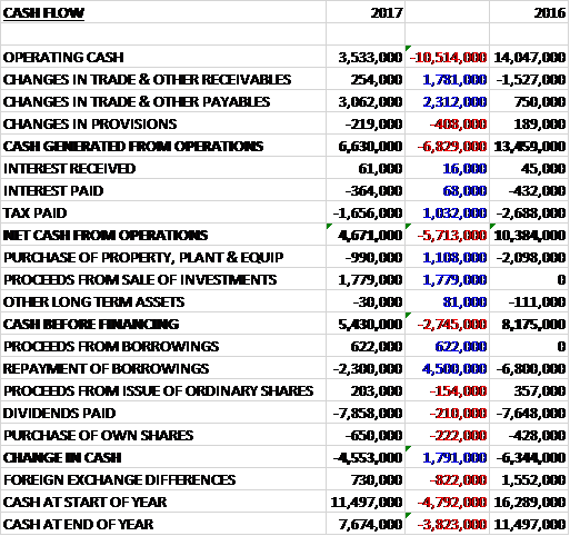 Before movements in working capital, cash profits fell by £10.5M to £3.5M. There was a cash inflow from working capital due to a rise in payables and after tax payments declined by £1M the net cash from operations came in at £4.7M, a decline of £5.7M year on year. The group spent £990K on capex but recouped £1.8M from the sale of the Baltic Exchange shares to give a free cash flow of £5.4M. This didn’t cover the £7.9M paid out in dividends and after the group also paid back some borrowings there was a cash outflow for the year of £4.6M and a cash level of £7.7M at the year-end.