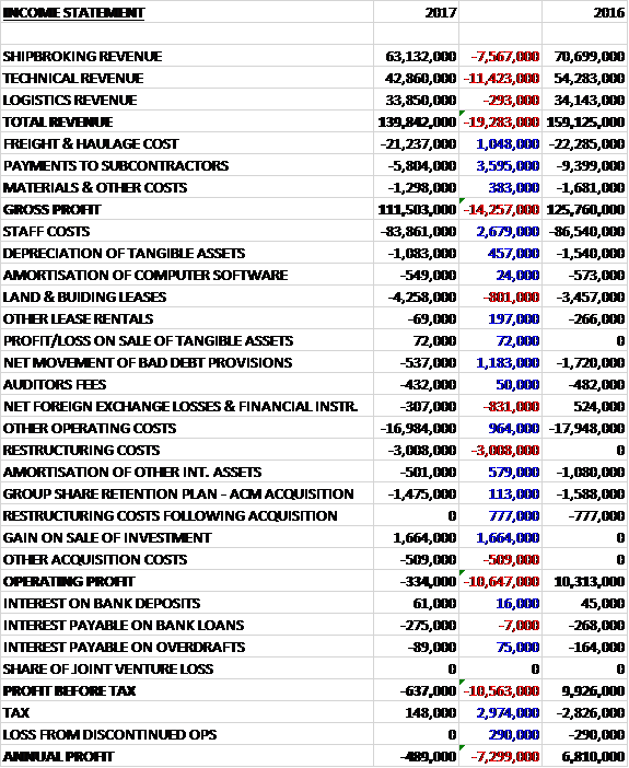 Revenues declined when compared to last year due to a £7.6M decrease in shipbroking revenue and an £11.4M fall in technical revenue. Freight and haulage costs were down £1M, payments to subcontractors decreased by £3.6M and materials costs fell by £383K to give a gross profit £14.3M below that of last year. We then see a £2.7M decline in staff costs, a £457K decrease in depreciation, a £1.2M fall in bad debt provisions and a £964K decrease in other operating costs, partially offset by an £801K growth in land and building leases and an £831K negative forex swing. There was also a £2.2M growth in restructuring costs and a £509K increase in other acquisition costs but amortisation was down £579K and there was a £1.7M gain on the sale of an investment which meant that the group made an operating loss, a negative swing of £10.6M. Interest costs were slightly lower and tax charges saw a £3M positive swing, all of which gave an annual loss of £489K, a negative swing of £7.3M year on year.