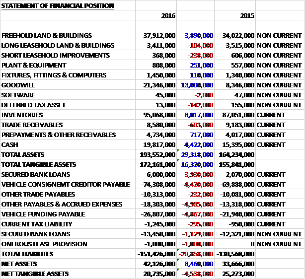 When compared to the end point of last year total assets increased by £29.3M driven by a £13M growth in goodwill, an £8M increase in inventories, a £4.4M growth in cash levels and a £3.9M increase in the value of freehold land and buildings. Total liabilities also increased due to a £5M growth in accrued expenses and other payables, a £4.9M increase in vehicle funding payable, a £4.4M growth in the vehicle consignment creditor payable, a £5.1M increase in secured bank loans and a £1M onerous lease provision relating to the JLR dealership acquired in Woodford. The end result is a net tangible asset level of £20.7M, a decline of £4.5M year on year.