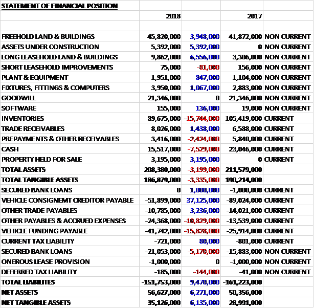 When compared to the end point of last year, total assets declined by £3.2M driven by a £15.7M decrease in inventories, a £7.5M fall in cash and a £2.4M decline in prepayments and other receivables, partially offset by a £6.6M growth in long leasehold land and buildings, a £5.4M growth in assets under construction, a £3.9M increase in freehold land and buildings and a £3.2M property held for sale. Total liabilities declined during the year as a £15.8M increase in vehicle funding payable, a £10.8M growth in other payables and accrued expenses and a £4.2M fall in secure bank loans were more than offset by a £37.1M decline in the vehicle consignment creditor payable and a £3.2M decrease in other trade payables. The end result was a net tangible asset level of £35.1M, a growth of £6.1M year on year.