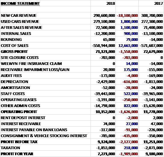 Revenues declined when compared to last year as a growth in after sales and used car revenue was more than offset by an £18.1M decline in new car revenue. Cost of sales declined by £12.7M to give a gross profit £1.6M lower. The group incurred site closure costs of £703K, operating lease payments were up £250K and depreciation increased by £616K, although staff costs declined by £522K and other admin costs were down £890K which meant that the operating profit was £1.6M lower. Consignment and vehicle stocking interest grew by £435K to give a profit of £7.3M, a decline of £1.9M year on year.
