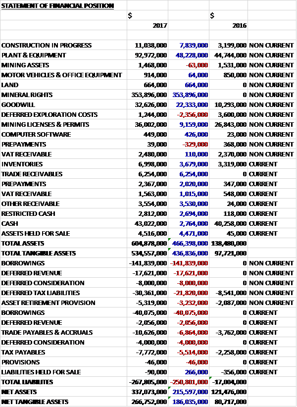 When compared to the end point of last year, total assets increased by $466.4M driven by a $354M growth in the value of mineral rights, a $22.3M increase in goodwill, a $48.2M increase in plant and equipment, and a $9.2M increase in the value of mining licenses and permits. Total liabilities also increased during the year sue to a $181.9M increase in borrowings, a $21.8M growth in deferred tax liabilities, a $17.6M increase in deferred revenue and a $12M growth in deferred consideration. The end result was a net tangible asset level of $266.8M, a growth of $186M year on year.