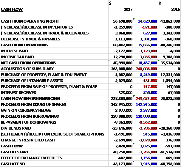 Before movements in working capital, cash profits increased by $14.6M to $56.7M. There was a cash inflow from working capital but interest payments increased by $2.1M and tax payments were up $3.1M to give a net cash from operations of $46M, a growth of $10.5M year on year. The group spent $4.1M on tangible assets and $2M on intangibles but the big spend was the $268M spent on the acquisition which meant that before financing there was a cash outflow of $227.8M. The group also paid out $23.1M in dividends but brought in $142.9M from the share issue and $120M from new loans. The end result was a cash flow of $2.4M and a cash level of $43.2M at the year-end.