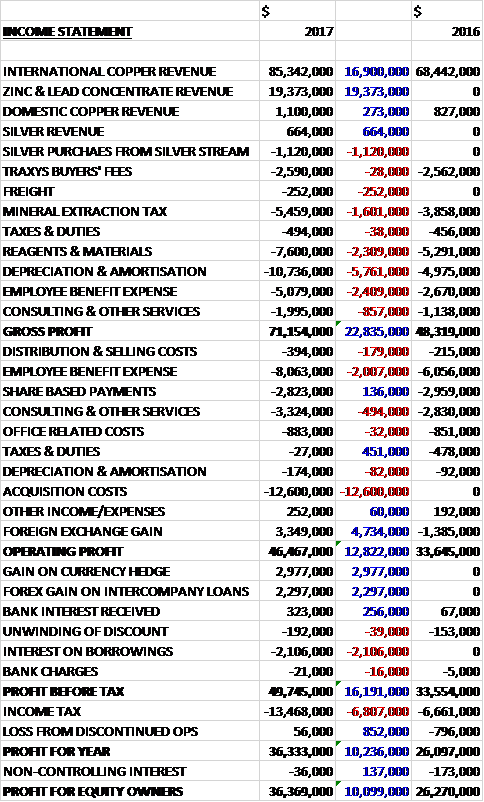 Revenues increased when compared to last year with a $16.9M growth in international copper revenue and a $273K increase in domestic copper revenue. There was also the first signs of zinc/lead revenue along with silver revenue which brought in $19.4M and $664K respectively. Mineral extraction tax was up $1.6M, reagents and materials increased by $2.3M, depreciation and amortisation grew by $5.7M, the employee benefit expense was up $2.4M and other cost of sales increased by $857K to give a gross profit £22.8M higher. We then see a further $22M increase in employee benefit expenses and $12.6M of acquisition costs, partially offset by a $4.7M positive movement in forex hedges to give an operating profit $12.8M ahead. There was a further $3M gain on the currency hedge, and a $2.3M forex gain on intercompany loans but interest costs on borrowings increased by $2.1M and tax charges were up $6.8M to give a profit for the year of $36.4M, a growth of $10.1M year on year.