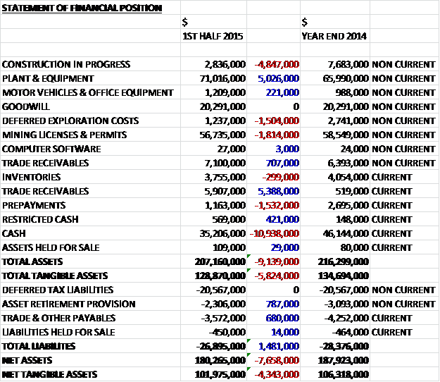 When compared to the end point of last year, total assets fell by $9.1M driven by a $10.9M decline in cash, a $4.8M fall in construction in progress, a $1.8M decrease in mining licenses and permits, a $1.5M fall in deferred exploration costs due to the re-measurement of the Copper Bay valuation and a $1.5M decline in prepayments, partially offset by a $5M increase in plant and equipment and a $5.4M growth in trade receivables as a result of $4.5M owed for the sale of copper for June deliveries which was received in early August.  Total liabilities also fell during the half year due to a $787K fall in asset retirement provisions and a $680K decline in payables.  The end result is a net tangible asset level of $102M, a decline of $4.3M over the last six months.