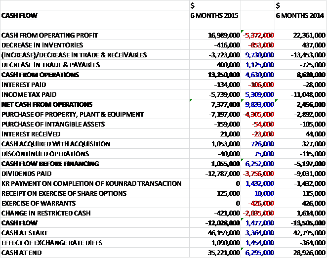 Before movements in working capital, cash profits fell by $5.4M to $17M.  Although receivables did increase, they did so much less than during the first half of last year and we also see the amount of tax paid almost halve so that the net cash from operations came in at $7.4M compared to a net outflow of $2.5M at this point of last year.  The group then spent all this cash on property, plant and equipment ($7.2M) and intangible assets ($159K) so there was not really any free cash.  The group then paid out a lot in dividends so that the cash outflow for the period was $12M to give a cash level of $35.2M at the end of the first half of the year.