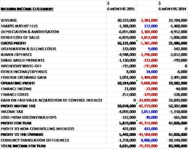 Revenues fell by $3.4M when compared to the first half of last year and both depreciation and other cost of sales increased year on year to give a gross profit some $5.4M lower.  Admin expenses increased by $1.3M, the foreign exchange gain was $1.4M lower than last time and there was a $715K inventory write-off so that operating profit fell by $9.1M.  There was no gain on the fair value acquisition of the acquired assets but tax was somewhat lower to give a profit attributable to the owners of $5.4M, a decline of $41.6M year on year.