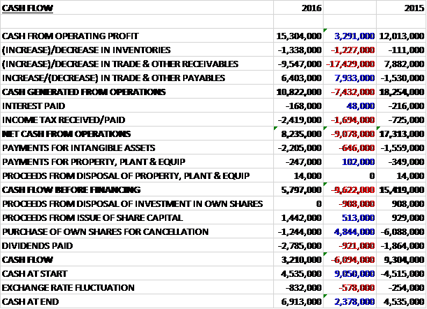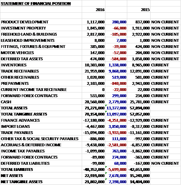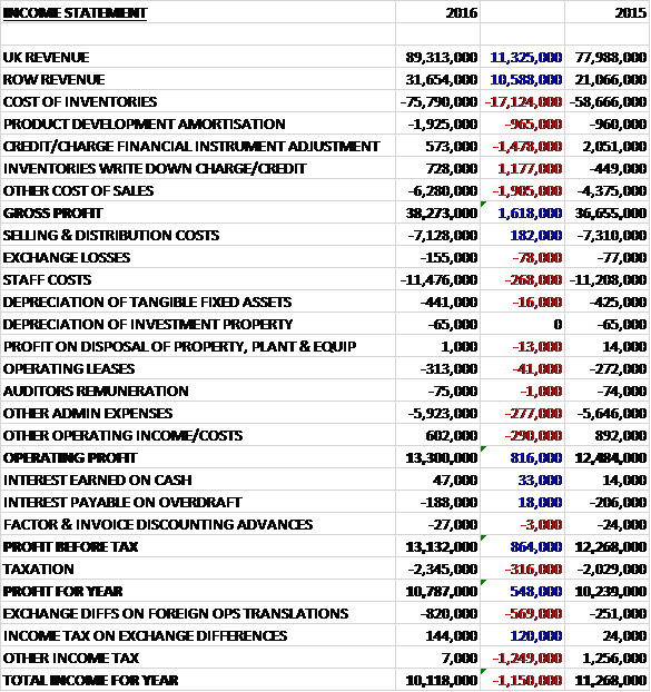 Revenues increased when compared to last year with an £11.3M growth in UK revenue and a £10.6M increase in ROW revenue, aided by the weakness of Sterling. Cost of inventories increased by £17.1M, amortisation was up £965K and other cost of sales grew by £2.2M to give a gross profit £1.6M ahead of 2015. Selling and distribution costs reduced by £182K but staff costs were up £268K and other operating expenses grew by £426K with a £290K fall in other operating income which meant that the operating profit was £816K higher. Finance costs were down marginally but tax charges increased by £316K to give a profit for the year of £10.8M, a growth of £548K year on year.