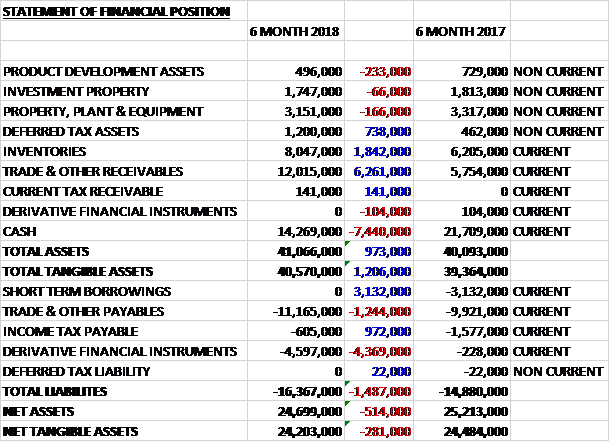 When compared to the end point of last year, total assets increased by £973K, driven by a £6.3M growth in receivables, a £1.8M increase in inventories and a £738K increase in deferred tax assets, partially offset by a £7.4M decrease in cash. Total liabilities also increased during the period as a £3.1M fall in short term borrowings and a £972K decline in income tax payable was more than offset by a £4.4M increase in derivative financial liabilities and a £1.2M increase in payables. The end result was a net tangible asset level of £24.2M, a decline of £281K over the past six months.