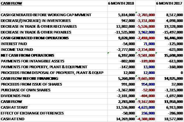 Before movements in working capital, cash profits declined by £2.7M to £5.8M. There was a cash inflow from working capital but this was less than last time and after tax payments increased by £2.2M, the net cash from operations was £6.2M, a decline of £9.5M year on year. The group then spent a net £376K purchasing shares and paid out £2.1M in dividends to give a cash flow for the half year of £2.8M and a cash level of £14.3M at the period-end.