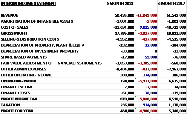 Revenues declined by £11M when compared to last year and with cost of sales down just £9M, the gross profit declined by £2M. There was a £417K growth in selling and distribution costs, a £3.3M increase in the losses from financial instruments and a £437K growth in other admin expenses which meant that the operating profit fell by £5.9M. There was a modest decrease in finance costs and a £934K decline in tax charges to give a profit for the period of £434K, a decline of £4.9M year on year.