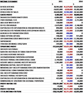 Revenue fell by $45.7M when compared to last year reflecting both lower oil prices and a decline in production and although depreciation was up $4.8M, other cost of sales declined by $23.9M to give a gross profit $26.6M below that of 2014. Salaries & consultancy costs increased by $940K but office overheads declined by $1.1M. We then see a $1.4M decrease in the amount capitalised to exploration and a $722K fall in the amount capitalised to development. There was a $16.2M decline in exploration costs written off but impairment costs increased by $53.7M which meant that the operating loss increased by $64.6M. We then see a $641K favourable decommissioning provision revision and a $1.3M decrease in in the interest payable on the convertible loan, partially offset by a $2.5M growth in the reserve based lending facility interest and a $594K increase in the RBL facility transaction cost. This all meant the loss for the year came in at $120.3M, a growth of $66.4M year on year.