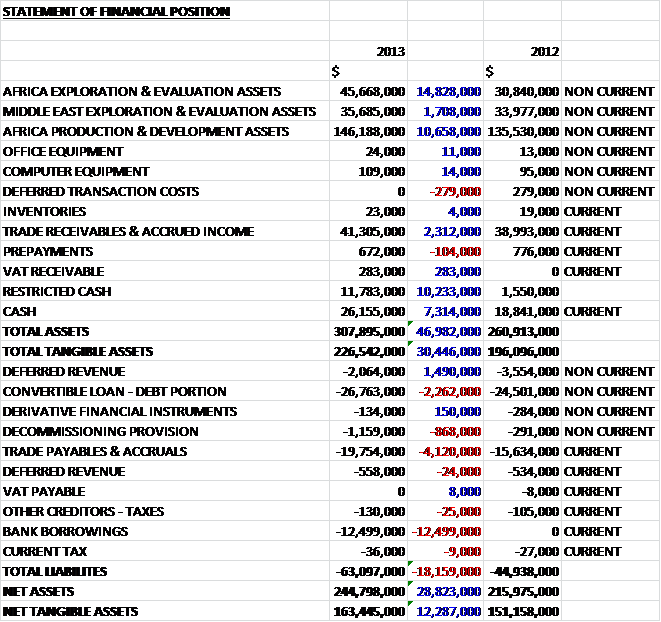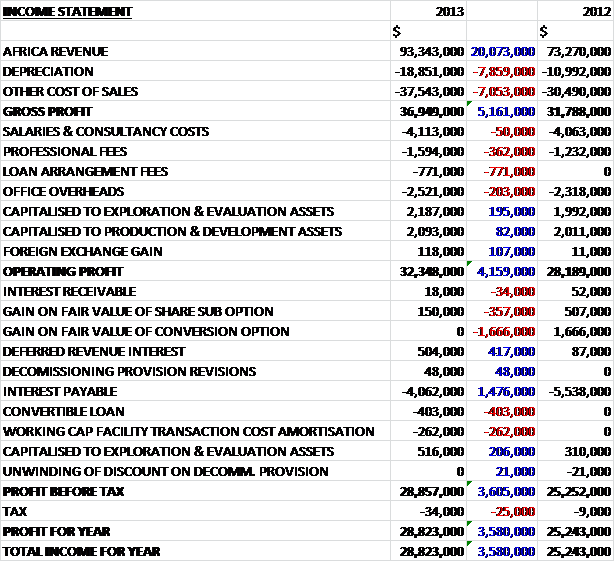 All revenues are currently made in North Africa and during the year they increased by $20.1M as the volume of both oil and gas sales increased along with increased prices achieved for gas sales in Morocco. Cost of sales and depreciation also increased to make gross profit some $5.2M higher than last year. Operating and admin costs increased, predominantly due to a $771K loan arrangement fee with smaller increases in professional fees and salaries, so that operating profit was $32.3M, a growth of $4.2M. The major change in finance costs was a $1.5M fall in interest payable offset by the lack of a $1.7M gain in the fair value of the conversion option and tax during the year was minimal so the overall profit for the year was $3.6M higher than 2012 at $28.8M.