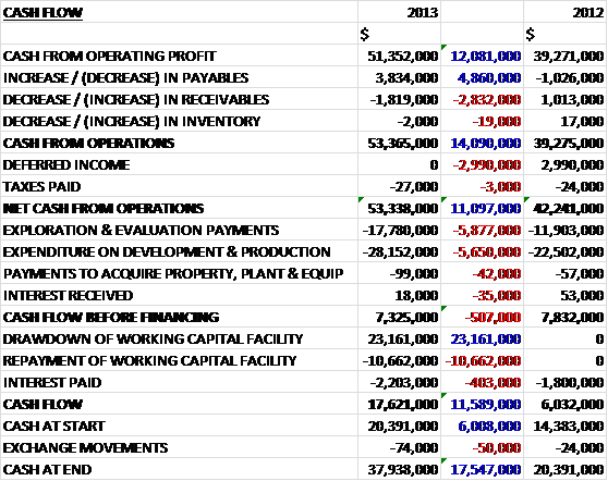 Before movements in working capital, cash profits were $12.1M higher at $51.4M before an increase in payables improved this to $53.4M, a growth of $14.1M. After the negligible tax, the net cash from operations was $53.3M, an increase of $11.1M on 2012 which seems like a good result. The bulk of this cash was spent on exploration and development costs with $17.8M and $28.2M respectively on each. This still left a free cash flow of $7.3M, slightly less than last year due to the higher capital expenditure. After interest was paid, the cash flow was still positive but a big drawdown on the working capital facility meant that the cash inflow for the year was $17.6M.