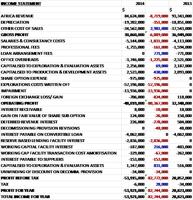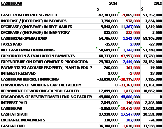 When compared to 2013, revenues fell by some $8.7M, mainly due to the lower price of oil but there was also a small decline in volumes in Egypt, and with cost of sales also declining gross profit was $6.1M lower at $30.9M. We then see staff and consultancy costs increase by $1M and office overheads up by $1.2M. The real damage was done by the one-off charges, however, with $57.4M of exploration costs written off due to the withdrawal from Oman and the expiration of the license at the Grombalia block in Tunisia; and impairments of $13.9M relating to the assets in Egypt due to the lower oil price environment, which meant that operating profit was $80.4M worse than last year. As far as finance costs are concerned, we see a $2.8M interest charge from the reserve based lending facility somewhat offset by an $831K increase in the amount of interest capitalised to exploration and evaluation assets. A negligible tax bill then meant that the loss for the year was $53.9M, a reversal of $82.7M year on year.