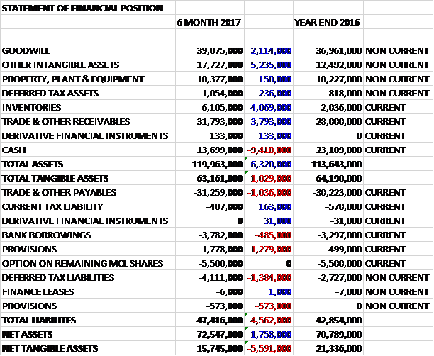 When compared to the end point of last year, total assets grew by £6.3M driven by a £2.1M rise in goodwill, a £5.2M increase in other intangible assets, a £4.1M growth in inventories and a £3.8M increase in receivables, partially offset by a £9.4M decline in cash levels. Total liabilities also grew during the period due to a £1.4M rise in deferred tax liabilities relating to the EID acquisition, a £1.9M increase in provisions and a £1M growth in payables. The end result was a net tangible asset level of £15.7M, a decline of £5.6M over the past six months.
