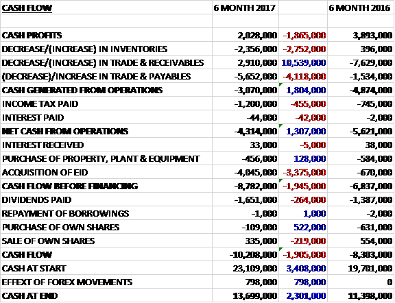 Before movements in working capital, cash profits declined by £1.9M to £2M. There was a large cash outflow from working capital, but less so than last year and after tax payments increased by £455K, the net cash outflow from operations was £4.3M, an improvement of £1.3M year on year. The group spent £456K on capex and £4M on the acquisition of EID to give a cash outflow of £8.8M before financing. The group then spent £1.7M on dividends to give a cash outflow of £10.2M and a cash level of £13.7M at the period-end – not a sustainable situation.