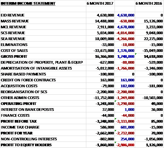 Revenues grew when compared to the first half of last year as a £4.7M growth in MCL revenue and a maiden £4.6M contribution from EID was partially offset by a £4.3M decline in SEA revenue, a £4M fall in SCS revenue and a £638K decrease in MASS revenue. Cost of sales declined to give a gross profit £1.7M ahead of last time. Amortisation charges grew by £1.8M and there were £2.2M of charges relating to the reorganisation of SCS which, along with a £1.2M growth in other admin costs, meant that the operating profit loss saw a £3.3M detrimental movement. The income tax rebate (relating to deferred tax) represented an improvement of £601K, however, to give a loss for the period of £1.9M, a detrimental movement of £3M year on year.
