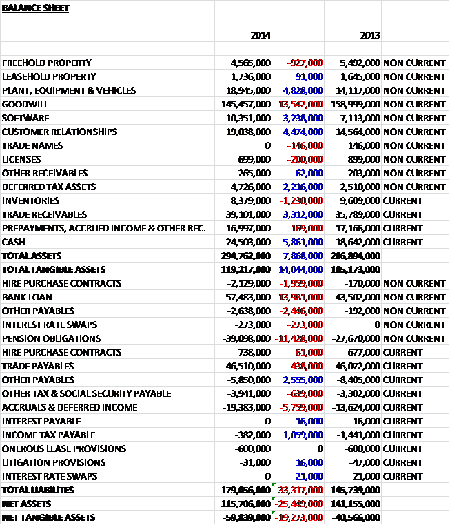 When compared to the end point of last year, total assets increased by £7.9M driven by a £5.9M growth in cash levels, a £4.8M increase in plant and equipment, a £4.5M growth in customer relationships, a £3.3M increase in trade receivables and a £3.2M increase in the value of software.  Total liabilities also increased due to a £14M growth in bank loans, an £11.4M increase in pension obligations and a £5.8M growth in accruals and deferred income.  The end result is a net tangible asset level of -£59.8M, a deterioration of £19.3M which doesn’t look all that good to me.