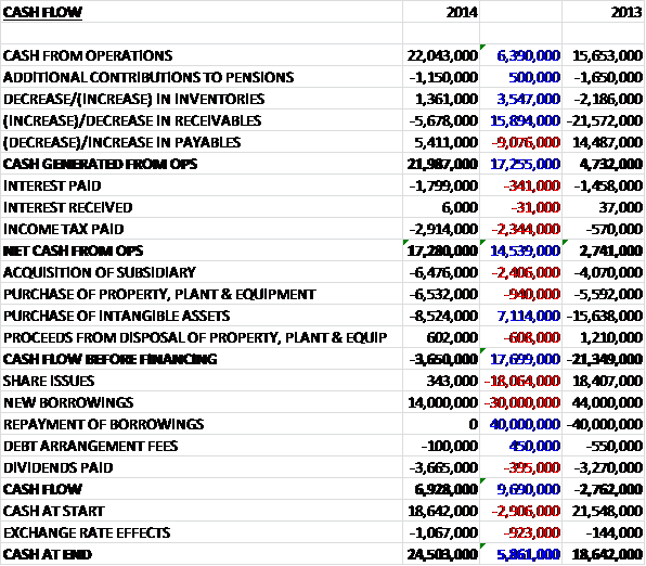 Before movements in working capital, cash profits increased by £6.4M to £22M.  There was a broadly neutral working capital situation this year compared to the large outflow last year driven by a huge increase in receivables so, despite an increase in interest and tax, the net cash from operations, at £17.3M, was £14.5M greater than last year.  This was enough to cover the purchase of fixed assets and intangibles but not the acquisitions so that before financing there was a cash outflow of £3.7M.  After dividends were paid out and the group took out new borrowings of £14M to give a cash flow of £6.9M for the year and a cash level of £24.5M at the year-end.