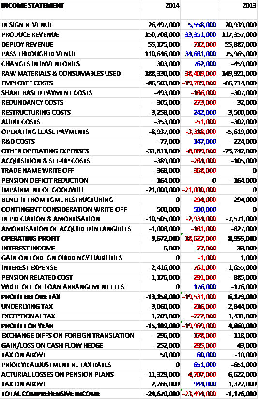 Overall revenues increased when compared to last year as a £712K decline in Deploy revenues was more than offset by a £34.7M increase in pass through revenue, a £33.4M growth in Produce revenue and a £5.6M increase in Design revenue.  Raw materials cost £38.4M more than last year and employee costs were £19.8M above last year.  We also see a £3.3M increase in operating lease costs, a £2.9M growth in depreciation and amortisation, and a £6.1M growth in other operating costs.  The operating profit was adversely affected by a £21M impairment of goodwill this year, however, which meant that it was £18.6M below that of 2013.  We then see an increase in interest costs and a small growth in taxes so that the loss for the year came in at £15.1M, an adverse movement of £20M year on year.  Clearly if it were not for the goodwill impairment, however, then the profit would be ahead of last year.