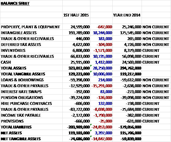 When compare to the end point of last year, total assets increased by £28.3M driven by an £18.2M growth in intangible assets, a £10.7M increase in receivables and a £1.4M growth in cash partially offset by a £1.6M fall in inventories. Total liabilities also increased during the period due to a £23.3M growth in payables and a £1.8M increase in income tax payables. The end result is a net tangible liability level of £74.7M, a detrimental movement of £14.8M over the past six months so the already poor balance sheet is getting worse.
