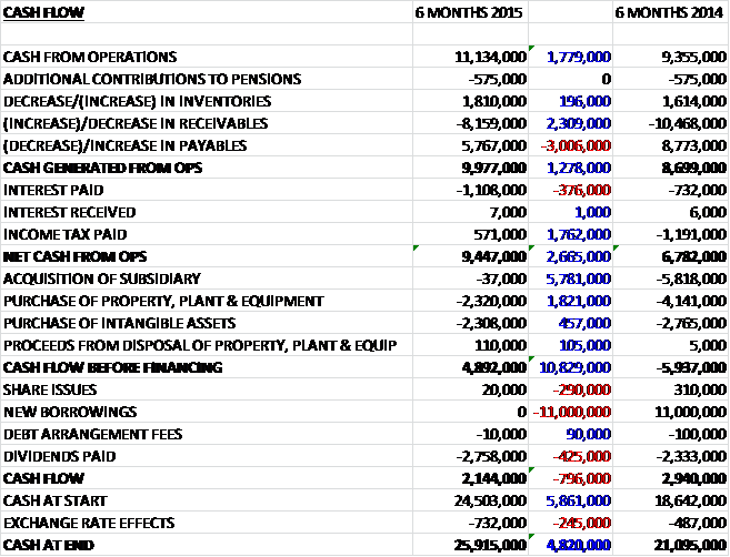Before movements in working capital, cash profits increased by £1.8M to £11.1M. We then see a bit of a cash outflow from working capital due to an increase in receivables but after a tax receipt as opposed to a cost last time, the net cash from operations was £9.4M, an increase of £2.7M year on year. The group then spent £2.3M on intangible assets and a very similar amount on property, plant and equipment which is apparently a more normal capex level, to give a free cash flow of £4.9M. After the dividends were paid out, the cash flow for the first half of the year was £2.1M to give a cash level of £25.9M at the period-end.