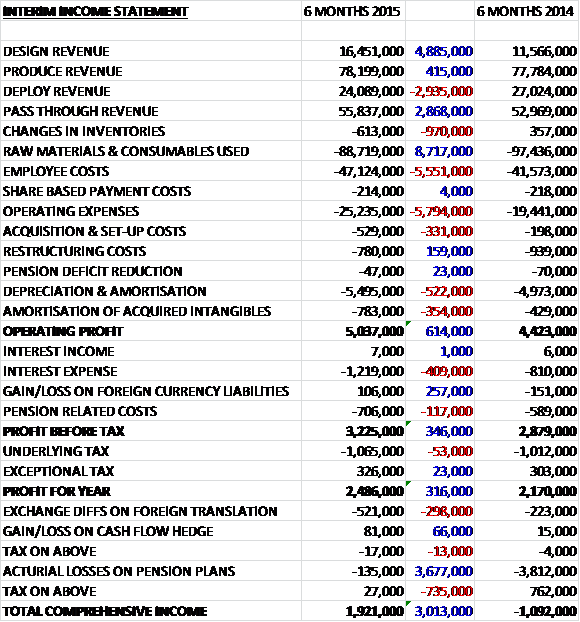 Revenues increased when compared to last year as a £2.9M decline in deploy revenue was more than offset by a £4.9M growth in design revenue reflecting a full six months’ contribution from the agencies acquired last year; a £2.9M growth in pass through revenue and a £415K increase in produce revenue. We then see an £8.7M fall in raw material costs but employee costs were up £5.6M and operating expenses increased by £5.8M, along with an increase in depreciation and amortisation to give an operating profit some £614K ahead of last year. There was a higher interest cost and a slightly higher pension cost which meant that the profit for the half year was £2.5M, an increase of £316K year on year.