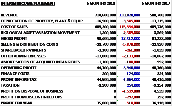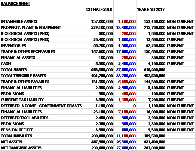 Revenues increased by £133.8M when compared to the first half of last year (£26M from Ballymena, £3.5M from Crown Chicken and the rest organic). Depreciation was up £3.6M, other costs of sales increased by £115.6M and there was a £2.4M fall in the growth in the value of the pig inventory to give a gross profit £12.3M higher. Selling and distribution costs were up £5.9M and admin expenses grew by £2.4M which meant that the operating profit was £3.9M higher. Finance costs were down £124K and tax charges fell by £254K but there was no profit from the discontinued operation which was £297K last time. All of this meant the profit for the period was £35.6M, a growth of £4M year on year.