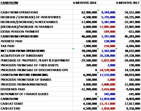 Before movements in working capital, cash profits increased by £8.3M to £62.9M. There was a cash outflow from working capital but an increased tax charge was offset by a reduced interest charge and the net cash from operations was £39.5M, a growth of £1.4M year on year. The group spent £29.5M on capex and £4M on an acquisition, relating to contingent consideration, to give a free cash flow of £6.2M. This didn’t cover the dividends of £11.9M and the group too out £8M of new loans to give a cash flow of £2.4M and a cash level of £6.5M at the period-end.