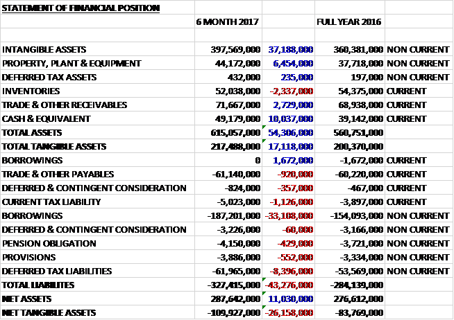 When compared to the end point of last year, total assets increased by £54.3M driven by a £37.2M growth in intangible assets, a £10M increase in cash, a £6.5M growth in property, plant and equipment and a £2.7M increase in receivables, partially offset by a £2.3M decline in inventories. Total liabilities also increased during the period due to a £31.4M growth in borrowings and an £8.4M increase in deferred tax liabilities. The end result was a net tangible asset level of -£109.9M, a deterioration of £26.2M over the past six months – I would like to see this debt stabilise now.