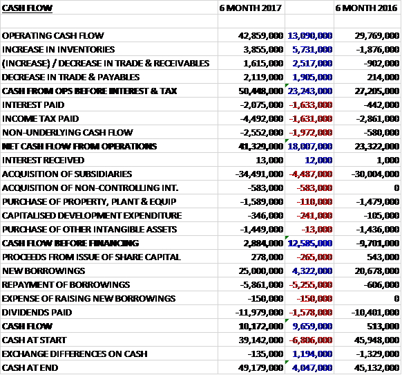 Before movements in working capital, cash profits increased by £13.1M to £42.9M. There was a cash inflow from working capital so despite interest payments increasing by £1.6M, tax payments growing by £1.6M and non-underlying cash flow increasing by £2M the net cash from operations was £41.3M, a growth of £18M year on year. The group spent most of this, £34.5M, on acquisitions along with £1.6M on fixed assets and £1.8M on intangibles to give a free cash flow of just £2.9M. This didn’t cover the £12M paid out in dividends so the group took out a net £19.1M of new borrowings to give a cash flow of £10.2M and a cash level of £49.2M at the period-end.